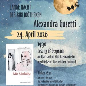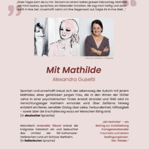 Aexandra Gusetti, Autorin, Philosophin Antonella Tiburzi, Historikerin Mittwoch, 29. April 19.00, Frauenmuseum Meran, Eintritt frei Ein Beitrag zur Aufarbeitung transgenerationaler Traumata und einem bedingungslosen Nie-Wieder.” „Eines Tages kam sie zu mir. Sie kam an einem kalten grauen Februartag. Mathilde rief mich lautlos, sprachlos, ein liebevoller Schatten. Sie zog mich heftig und doch sanft in ihre…